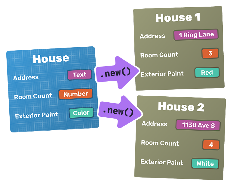 Let’s extend our house analogy a bit further. Imagine we have a blueprint (class) for building houses that specifies the properties each house has.